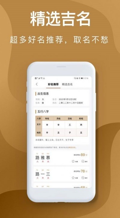 4、智能推荐:根据用户输入的命盘信息,自动推荐符合需求的姓名建议,省去用户手动筛选的繁琐步骤。