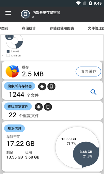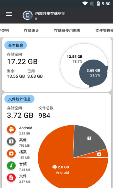 应用程序从设备存储列表中读取文件和文件特定数据(名称、路径、大小、上次修改日期、文件预览),以构建设备统计信息并以报告和文件的形式显示使用图(饼图、旭日图)。