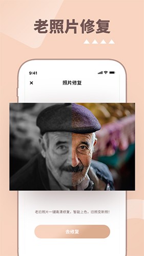 6、老照片修复:使用ai人工智能修复技术,可以将划痕破损、模糊不清、低清的老照片,一键增强、清晰、补色,面部表情高清修复,让老照片焕然一新。