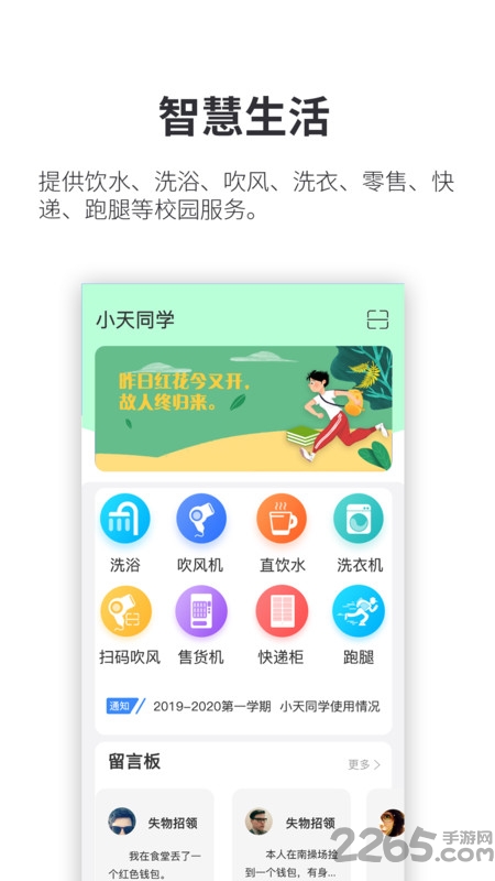 专为高校生打造的一站式生活服务平台,来小天同学app随时随地可以预约洗浴吹风和洗衣机等项目,为校园提供基于互联网+物联网的全新场景解决方案。小天同学在客户端实现了设备预约、无卡支付、订单查询、意见反馈、账户管理等功能,,让用户随时随刻随需体验想要的产品和服务。目前小天同学已经覆盖了校园饮水、洗浴、洗衣、洗鞋、吹风、零售、跑腿等生活场景,方便学生预约洗衣,在线充值,打破传统的刷卡、投币单一运营模式。