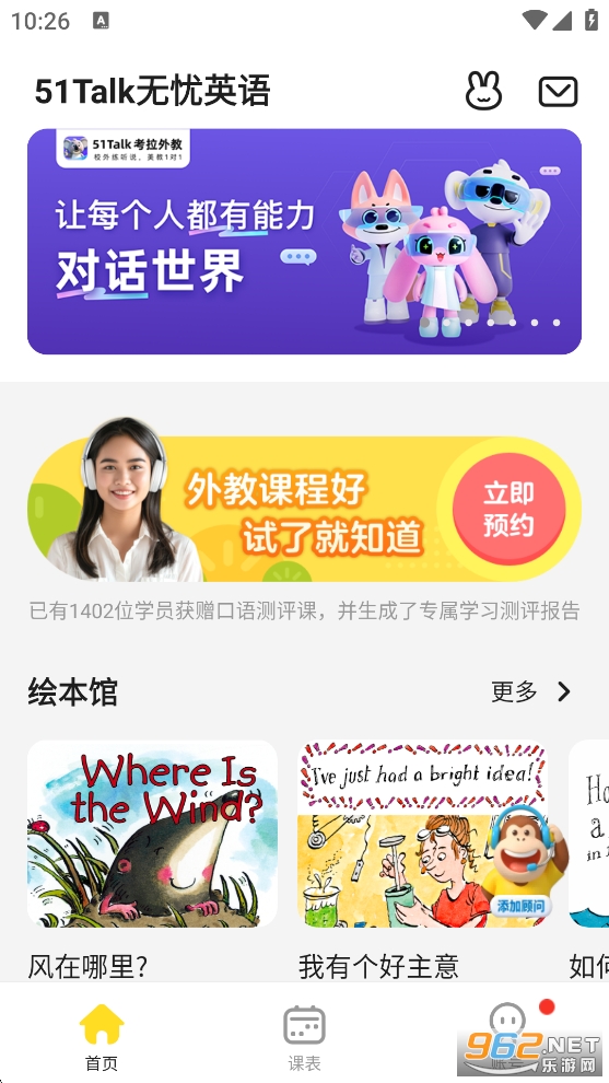 《51Talk无忧英语》是大生在线(深圳)文化传媒科技有限公司推出的一款英语学习平台,平台中有着众多的课程可以选择,可以观看各种直接教学,不断的巩固英语知识积累,提高英语水平,还可以去阅读各种英文绘本,边看故事边学习英语,让你快乐的学习。