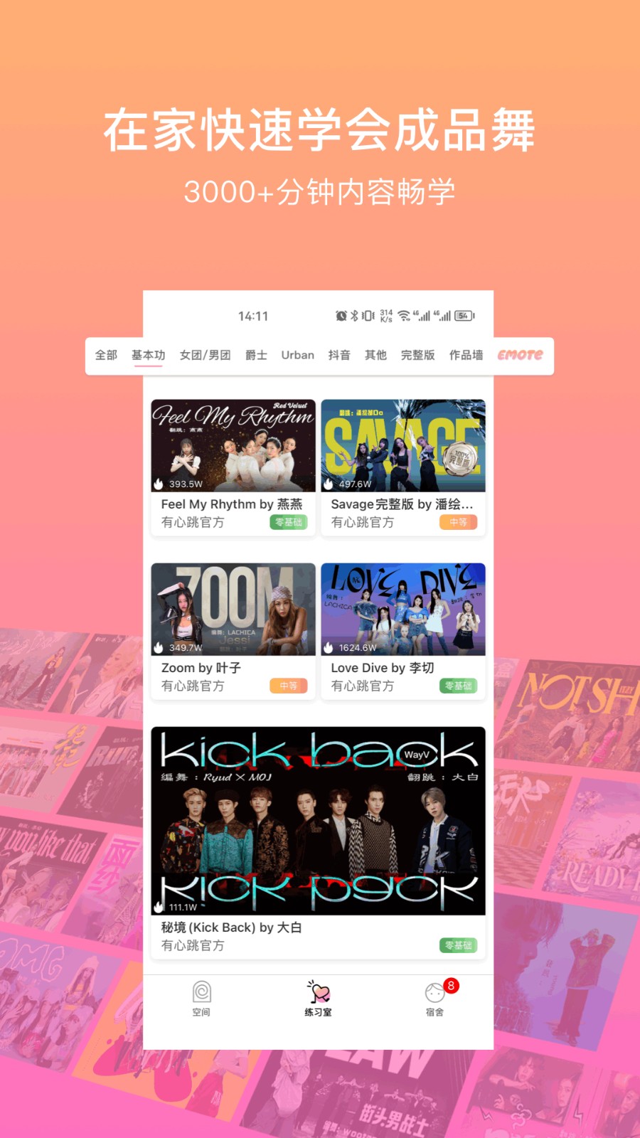 1、在家也能学:有心跳舞蹈随时随地都能学,在家也能快速进入学舞状态;
