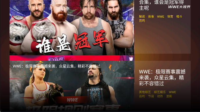 wwe大视界是一款专业的体育运动短片以及解说的电视应用!为广大用户们提供了非常丰富的摔角表演,全新电视版本高清大屏优质观影体验,在这里你可以选择你喜欢的内容进行观看,竞技、格斗、以及其他特色赛事解说应有尽有,按上下键就可以轻松切换视频内容,感兴趣的小伙伴们快来下载wwe大视界体验吧!