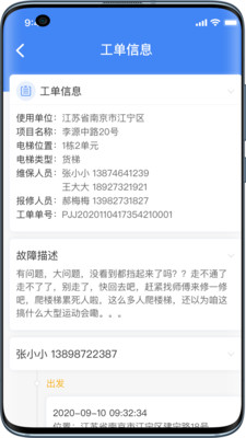 1、支持查看工单详情,包括使用单位、项目名称、电梯位置、报修人员等;