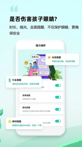 3、在光线较暗的情况下或者走路时查看手机时,系统也会提醒孩子休息。