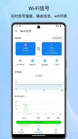 1、能够扫描识别所有WIFI热点,提供WIFI信号强度和速度的测试结果,