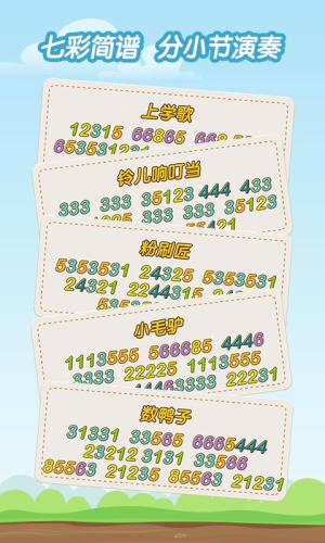 1、打开亲亲熊学弹琴后,先选择一首熟悉的儿歌,界面会显示对应的大按键音符,适合宝宝小手点击。