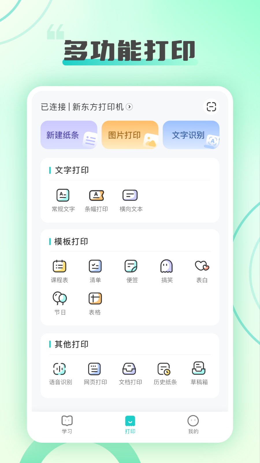 新东方打印可以支持多种打印功能,而且相比较其他的打印工具,这款打印机还拥有很多实用便利的教学功能,线上通过手机蓝牙进行连接,操作十分方便,内置丰富的学习知识和相关办公资料,都是可以免费提供给用户浏览使用的,你可以根据自己的需求选择自己需要的打印模板,不仅能够满足你的日常需求和办公条件,还能够为你提供更加便利的个性化服务,详细的使用指南已经为你提供,需要的伙伴们快来下载使用吧。