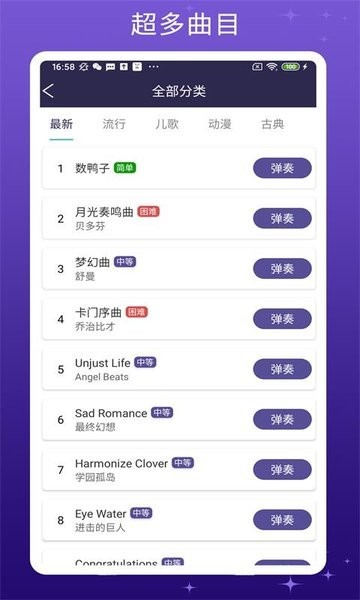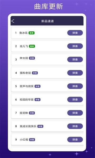 3、练习弹奏:学习完内置的标准弹奏,轻松升级打怪般的解锁曲目。