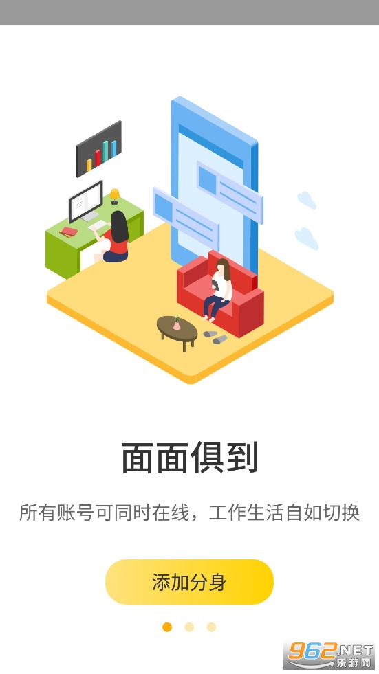 分身:点击“添加”按钮→跳转到应用列表页→点击“”,登陆你的第2个、第3个、第N个账号,就能实现你的多个在一部手机上同时在线聊天了。