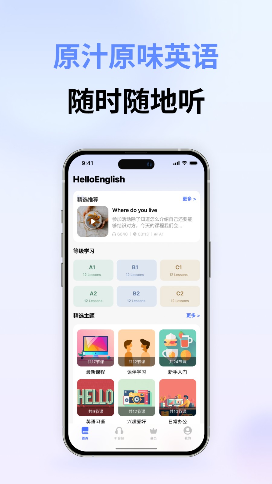 HelloEnglish APP 是一款随听随学英语知识的应用软件,它以情景学习理论为基础,覆盖了各种主题和生活场景,为你提供实用有趣.原汁原味的英文地道表达内容。你可以从中学习到 1500 多个词汇,以及 2800 多个常用语法知识点和经典例句。