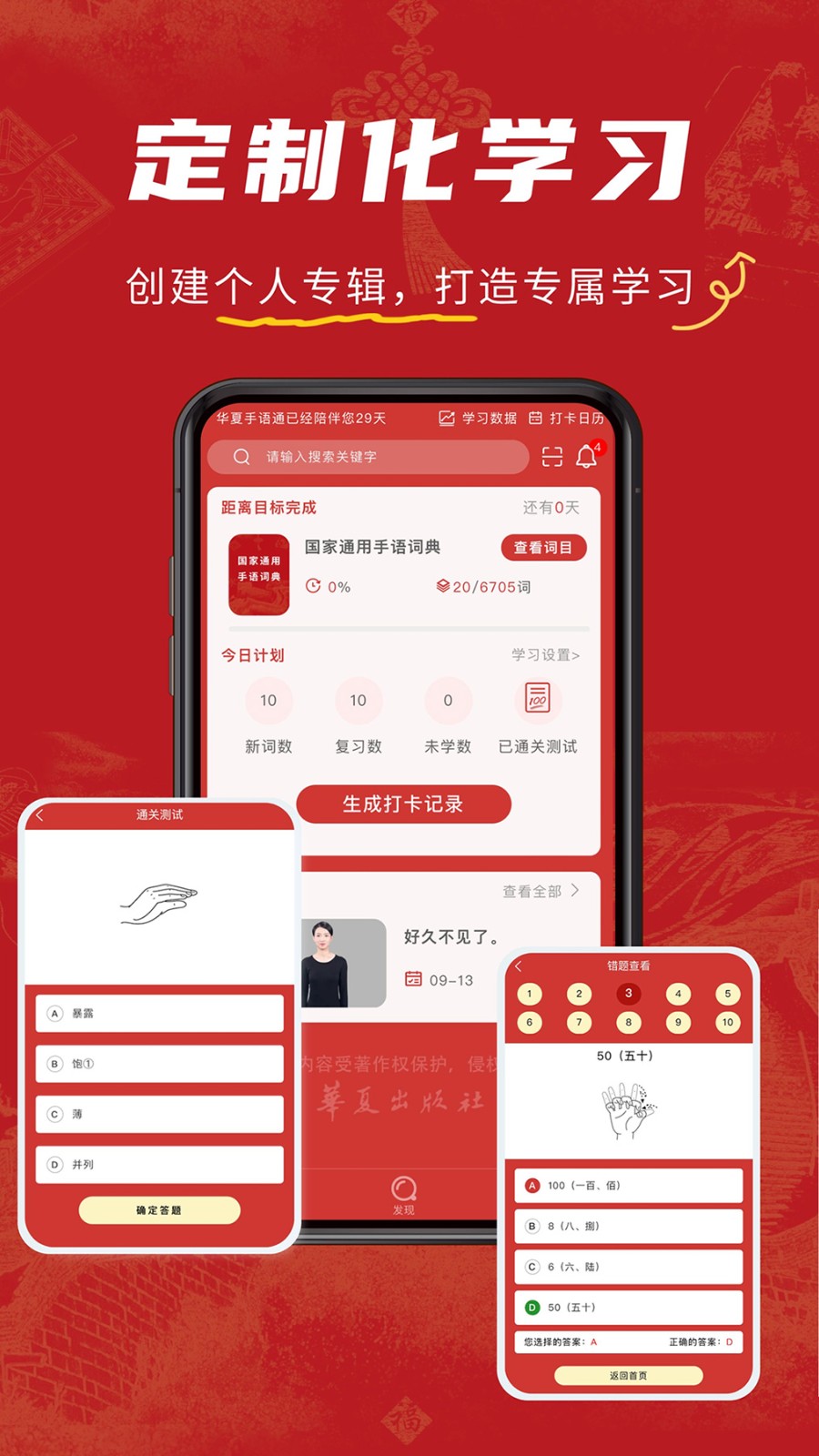 2、APP在词汇检索的基础功能上,还可以进行定制化学习,通过制定计划、通关测试、每日一句等方式,轻松掌握国家通用手语。