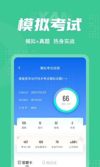 康复医学治疗技术题库内含考点练习,全国通用卷以及地区卷模拟练习,以及按照固定考试比重的随机式的抽题的真题考场,成绩单实时记录考试数据,一点一滴的反馈考生近期学习状态以及自我正确率的提升,大大的给予考生通过考试的信心。