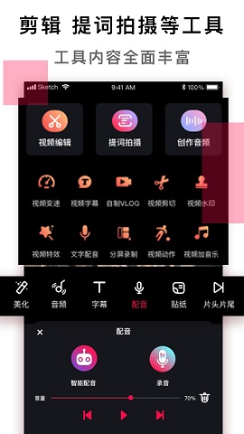 剪辑、字幕、美化、贴纸、转场、水印、特效、美颜全部都有,而且功能全免费,超越太多剪辑软件!
