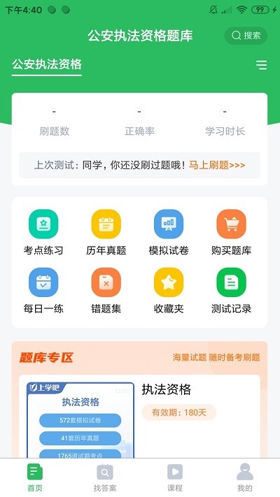 公安执法资格题库有模拟考场、历年真题练习、每日一练、快速练习、考点练习、考试押题、做题记录等多种学习与做题模式、丰富多样化的陪你一起考公安执法资格
