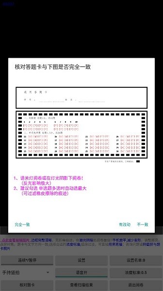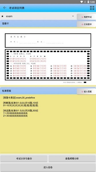 3、选择考试项目(即对应的标准答案),点击开始阅卷,按照相机上大写字符A的方向进阅卷,注意,应当尽量放平手机,并适当调整手机与试卷之间距离,使题卡在相机图像中居于中间位置,并大约占据3/4大小。