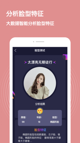 脸型识别器app就是脸型分析,是一款非常稳定好用的手机脸型识别软件哟,让用户们直接在手机上就可以进行稳定便捷的测试脸型功能等,操作简单方便,对于一些有需要的用户们来说是必备一款测试脸型软件哟,感兴趣的用户们就赶紧来下载吧。