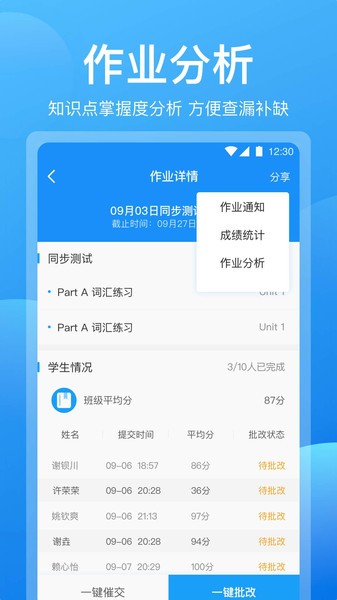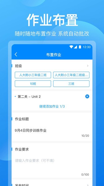 3、作业布置:支持背单词、同步测试、口语训练、听说等布置。