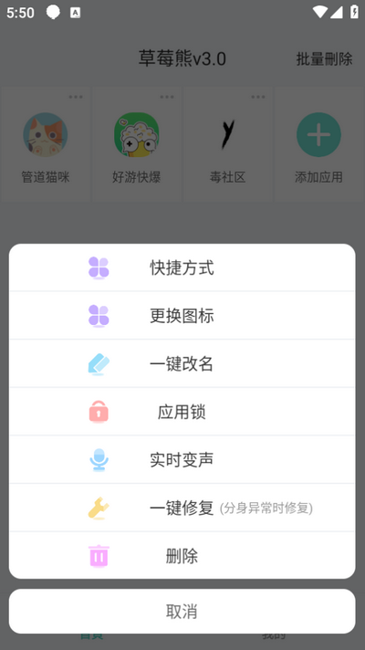 草莓熊3.0多开助手是一款功能强大的安卓应用,用户可以轻松在同一台设备上创建多个分身,每个分身都可以独立登录一个社交账号,且互不干扰,这对于需要在工作和生活中分别使用不同账号的用户来说,无疑是一大福音,有这方面需要的用户可以下载一个。