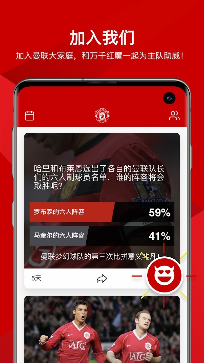 3、球迷专属。为中国球迷精心打造!提供曼联主题表情包,您还可以票选单场最佳球员!