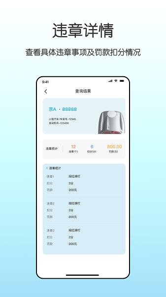 2. 违章查询:提供全国违章查询服务,数据更新及时,确保您能够快速、准确地查询到违章记录。