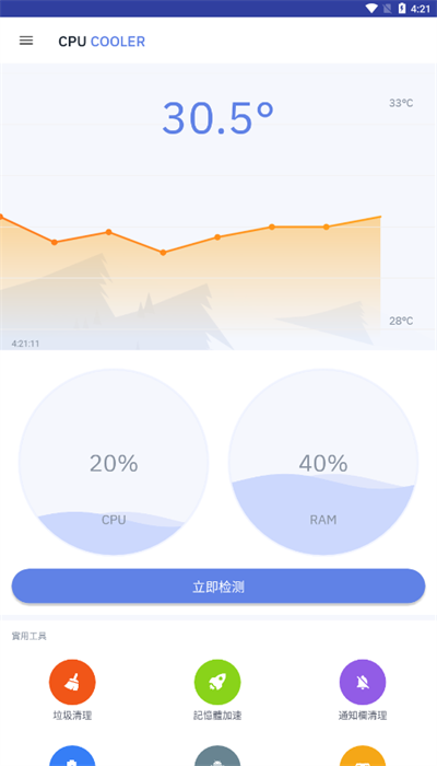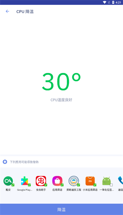 2.一键降温一键关闭发热应用,降低CPU能耗,让手机恢复正常温度。