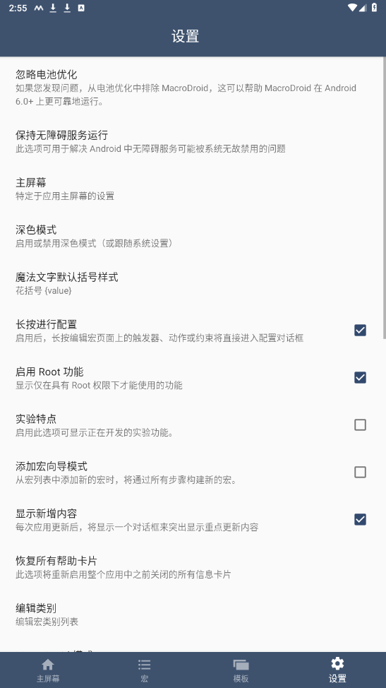 4、MacroDroid的相关设置,包括编辑模式,变量,语音,系统日志等