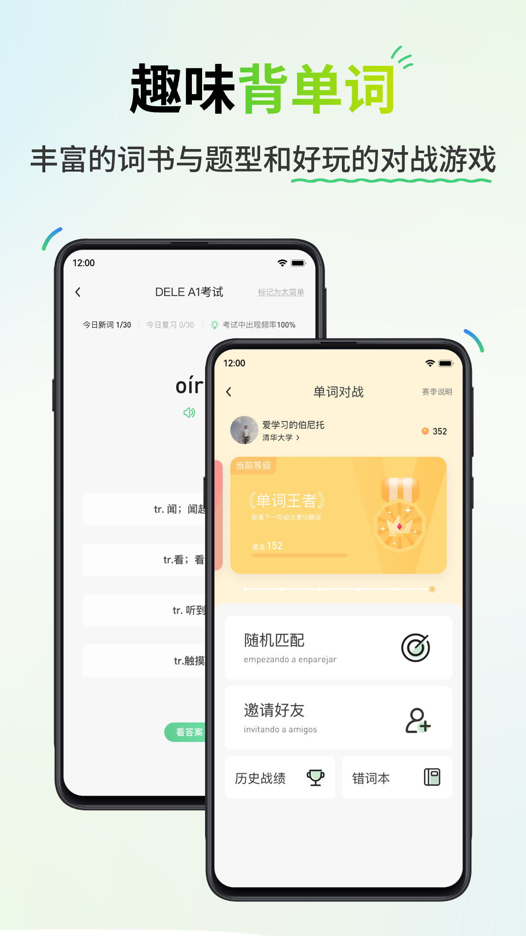 1、闯关式学习:趣味学习模式,细致讲解西班牙语基础。