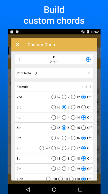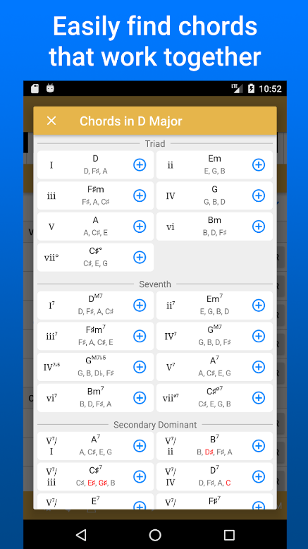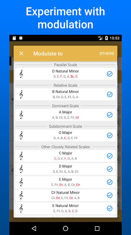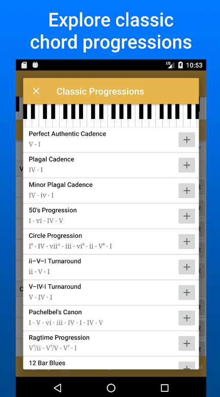 在应用程序的帮助下,您还将找出哪些和弦在任何键中有效地相互补充,从而允许您创建您的舔舐。借助此功能,用户可以拓宽对和弦进行的理解并发展他们的即兴创作技能。
