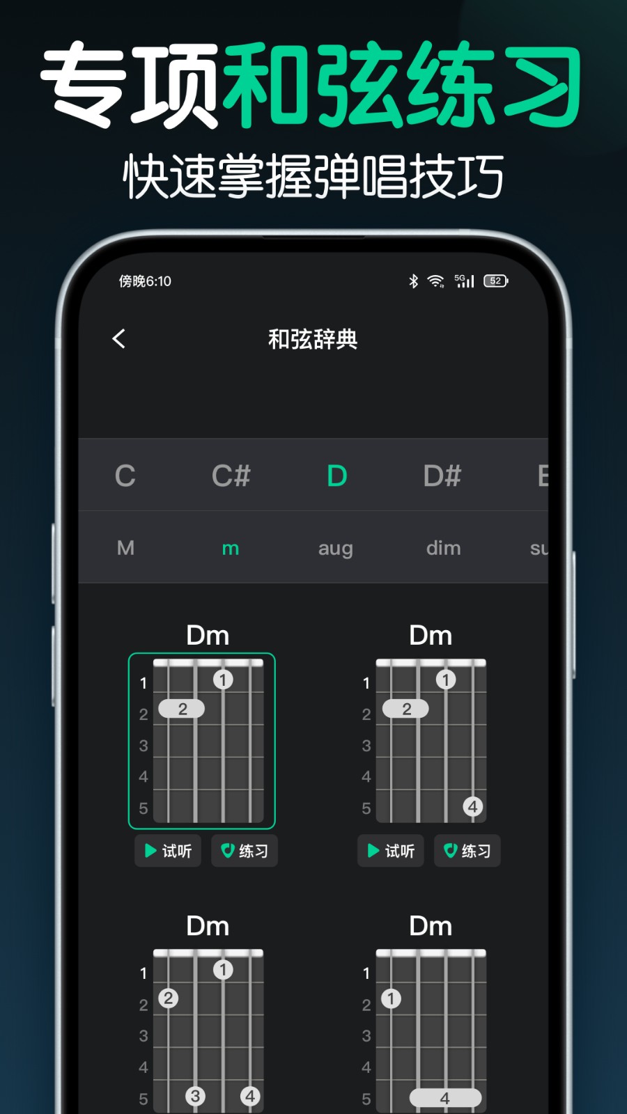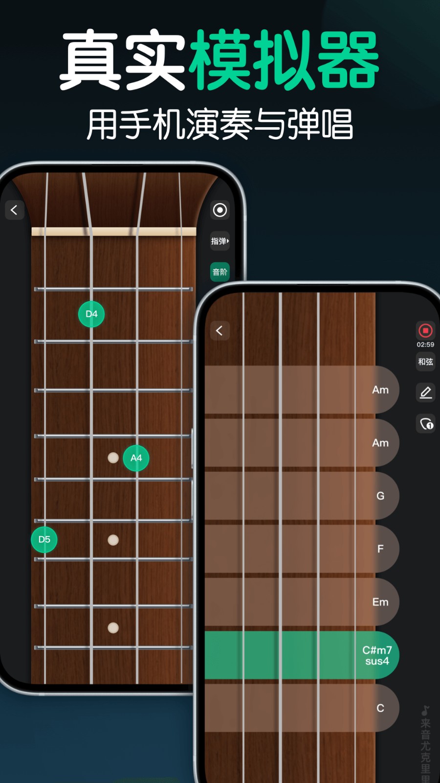 丰富的和弦练习、自定义和弦编辑,让弹唱歌曲更简单。