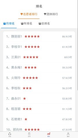 4、【排名】页则是展示了志愿者和团体的月排名、年排名、总排名等情况。