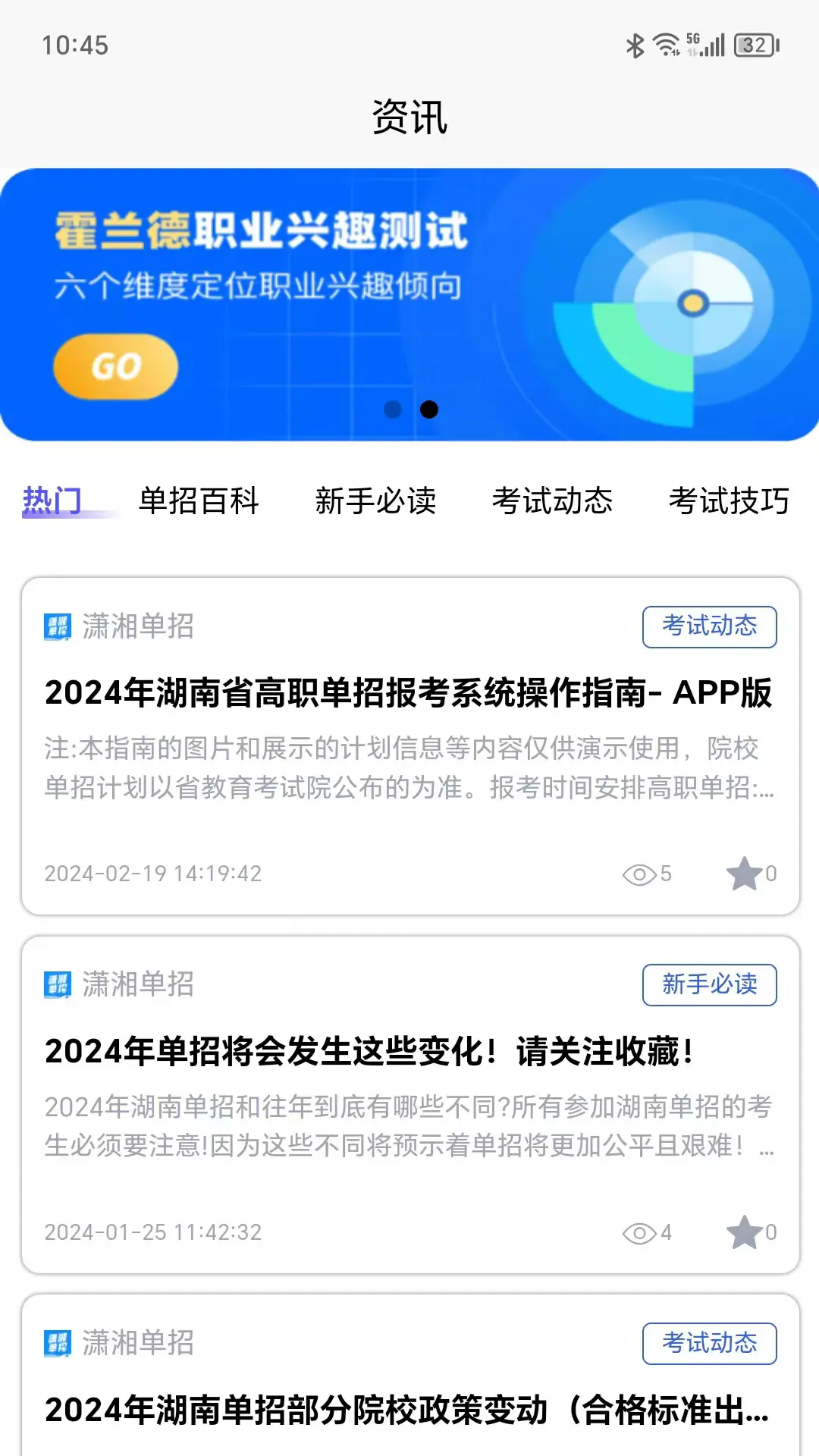 潇湘单招是湖南地区单招考试中专门为不同高考学生设计的线上综合服务软件,高职院校各学科专业信息,最新官方院校招生资讯和院校详细信息在这里都可以看到,用户可以根据自己的成绩和专业喜好来选择最适合自己的院校及专业进行志愿填报,在这里不仅可以随时了解你想去的院校和专业相关信息,还可以随时浏览各类重要高考题库资源,历年高考真题都可以轻松搜到,通过专业的测评服务来帮助你找到最好的专业。