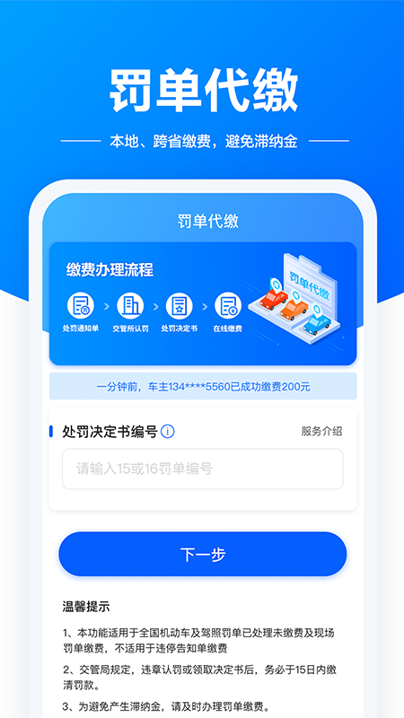 5、支持异地跨省缴费,立即查看违章罚单缴费的信息,轻松在线缴费,方便快捷;