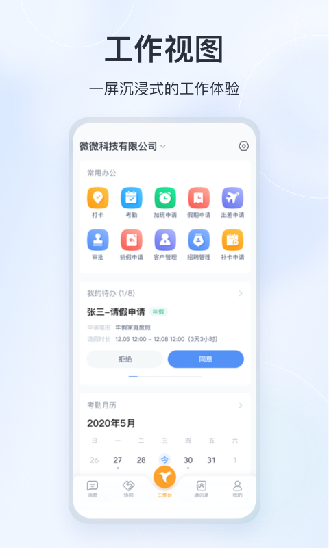 微微工作互联软件是可以帮助广大用户朋友们打造的大型商务办公类产品,复合大家的工作习惯等等完善的信息呈现其中,一屏沉浸式的工作体验其中。
