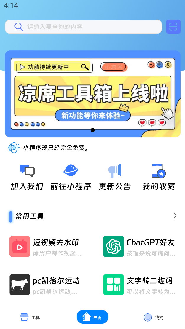 凉席工具箱是一款非常实用的手机工具箱软件,支持许多强大的功能,支持文字转二维码,手电筒功能,全平台短视频去水印,全平台图集解析,国庆头像生成,gpt内嵌,扫码等其他功能,非常的方便稳定,大家可以通过软件来实现多种服务,让大家可以进行稳定的日常生活操作等,喜欢的用户就赶紧来下载试试吧。