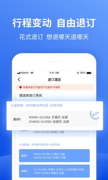 支持用户在线根据自己的行程来自由的退订酒店,轻松的进行使用。