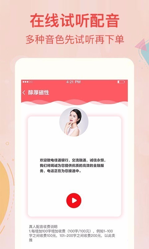 文字转语音合成是一款智能配音合成+真人配音的配音软件,适用于商场店铺促销,变声搞怪、广告促销配音、彩铃录制、视频配音、录制课件、地摊叫卖、英语听力、音频制作、有声朗读等多种场景语音合成的配音合成软件;专业文字转语音一键合成,语音转换即刻拥有。