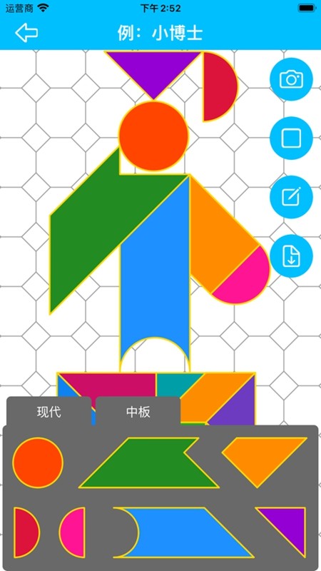 1、自由拼图: 可使用传统七巧板(中国传统、日式、欧式)和现代七巧板进行自由拼图,不受副数和尺寸限制,并支持生成和导出高清图片。