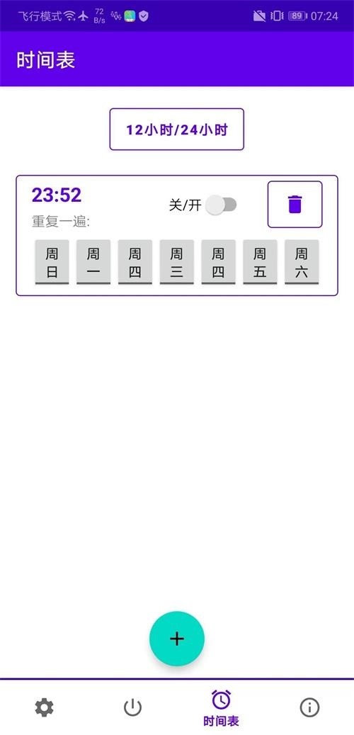 4、可以通过单击屏幕底部的+绿色按钮来创建新计划;每个计划都可以使用切换按钮打开和关闭,也可以使用删除(箱)按钮将其删除。要设置手机关闭的时间,您可以单击时间表,系统将显示时间选择器。
