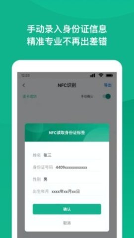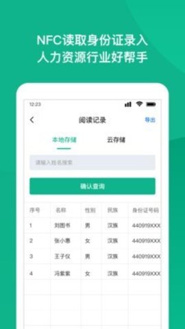 NFC身份证扫描app是一款专门为人力资源,劳务派遣,导游,会计等需要大量登记人员信息的行业提供方便快捷的录入工具,