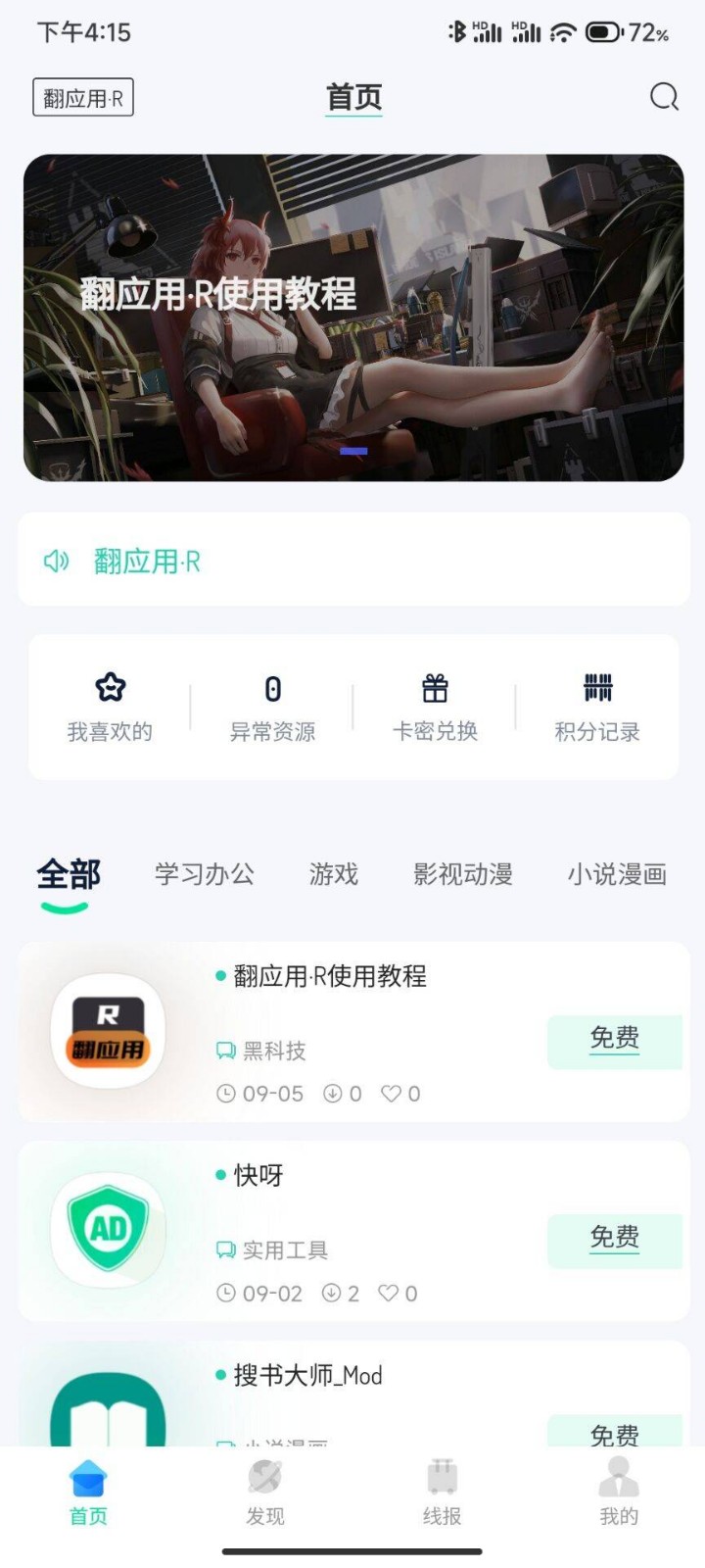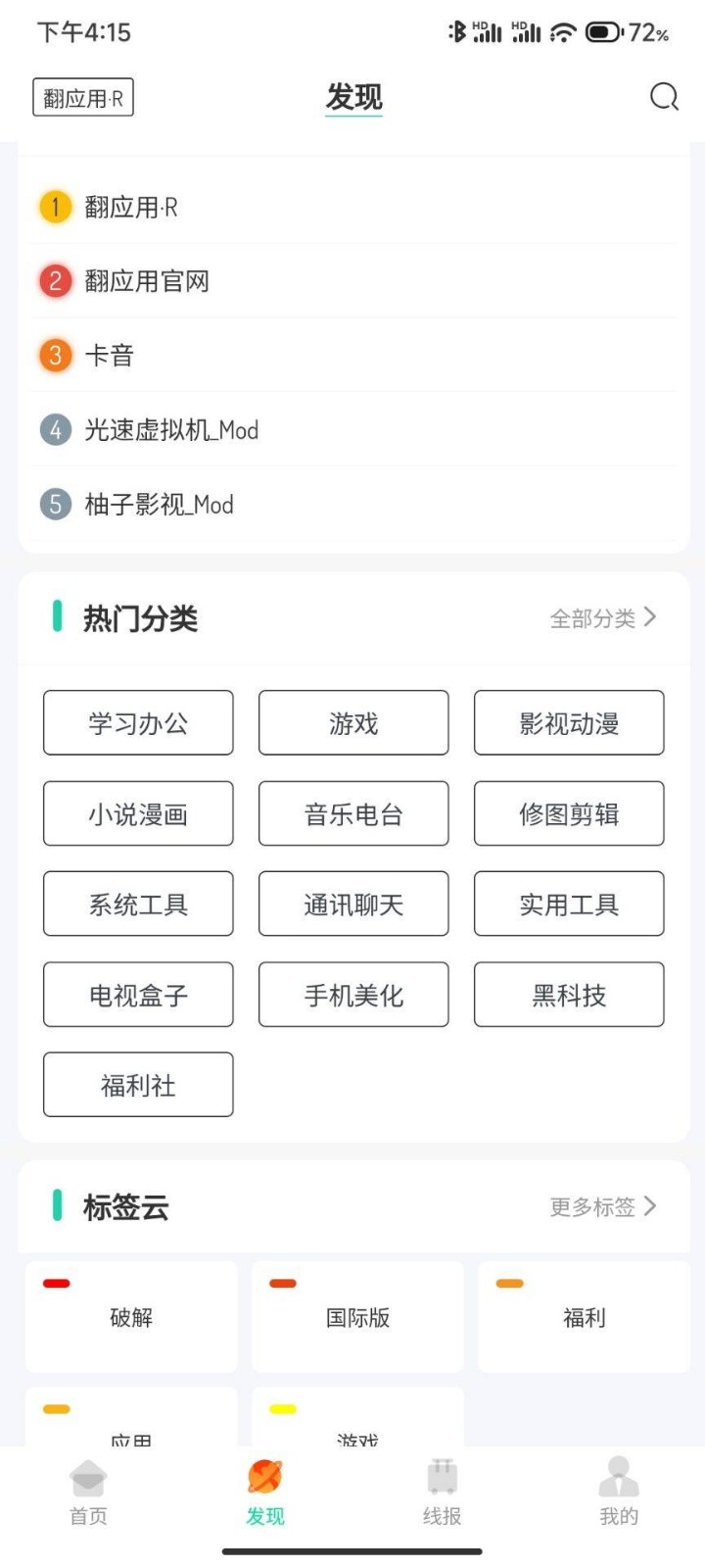 翻应用R专注发现优质安卓应用平台,类似软件库,该平台提供丰富的精品应用、游戏、黑科技、影视、壁纸等内容,都是可以免费使用的,平台资源更新也是非常快的,界面舒适,有需要的小伙伴们快来下载体验吧!