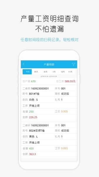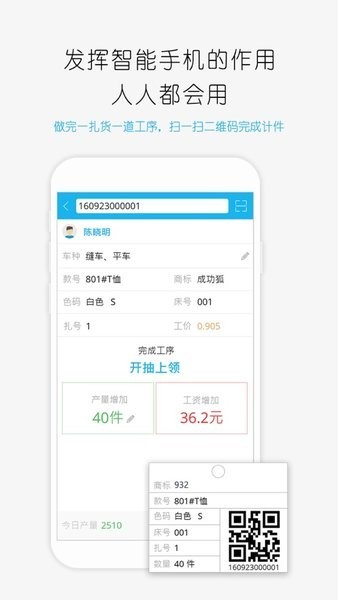适用于服装工厂。1扎货绑1张二维码,员工做完一扎货一道工序,扫一扫二维码完成计件。数据和ERP生产管理软件实时对接,产量统计、工资计算等。员工在手机上可查看自己每天每月的产量、工资。