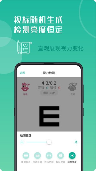 超级视力表app是一款专业实用的视力监测软件,由上海品腾信息技术有限公司精心打造而成。该软件能够为用户提供专业视力检测和结果记录,以及专业的护眼资讯,帮助用户轻松监测视力,及时发现近视状况,养成良好用眼习惯。除此之外,软件界面清爽简洁,操作实用非常简单,检测过程参照国家标准,并可自由设置视力表的测试模式,检查距离、视标大小、视标数量、屏幕亮度等参数随心调节,在确保视力检测准确性的同时提供个性化配置。同时超级视力表官方版汇集海量眼科专家,提供优质的人工客服,帮助用户解决各种难题,是你爱护眼睛的好助手。还在为视力下降烦恼吗,那就快来下载体验一下吧。