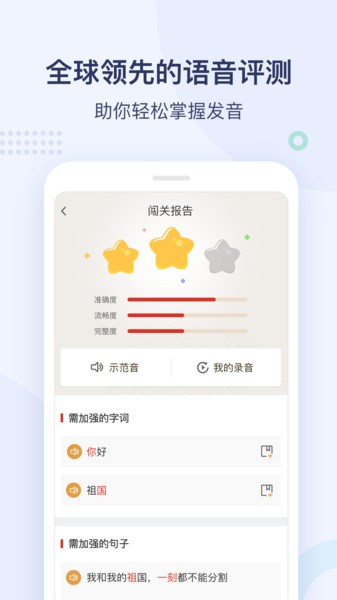3、实时语音提醒纠错测评,帮您有效提高发音标准;
