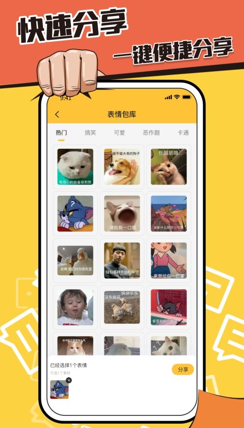 将自己制作的各种搞笑图片随时分享给自己的好友,与好友开启斗图模式,通过图片的内容使自己的心情变得更加愉快。