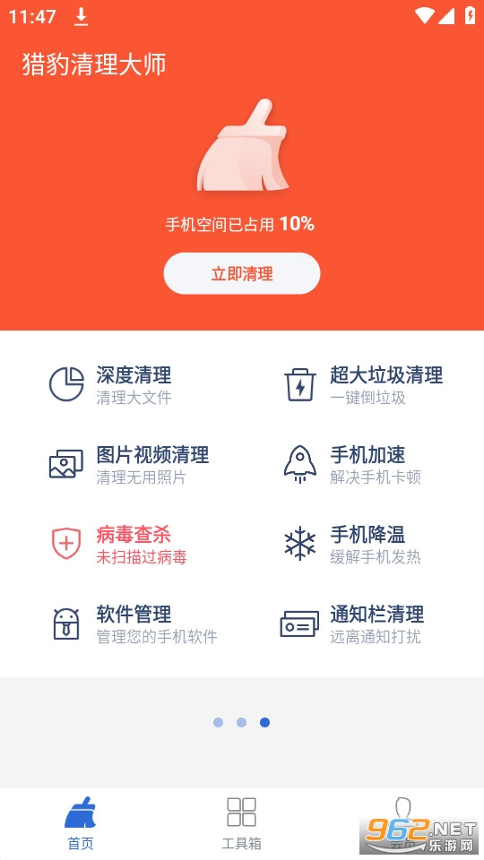 非常专业的手机优化软件,可以帮助用户快速扫描手机各个角落,将无用的垃圾文件、浏览记录等统统清除干净,释放更多的手机存储空间,有效提升运行速度,猎豹清理大师手机版秉承垃圾清理更快、更多、更干净的原则,让你的手机运行拥有飞一般的感觉。