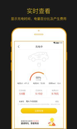 2、实时查看:显示充电时间、电量百分比及产生费用。