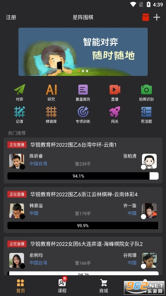 非常实用的围棋交流平台,用户可以在这里看到各种名场面的残局复刻或者与大师进行围棋练习,报名参加各种大奖赛来提升自己的棋艺与知名度哦,还有智能的围棋ai在线教你下棋,下载来试试吧。