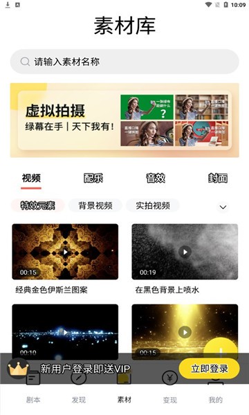 5、点击底端“素材”,绝大多数视频配乐等都免费下载;