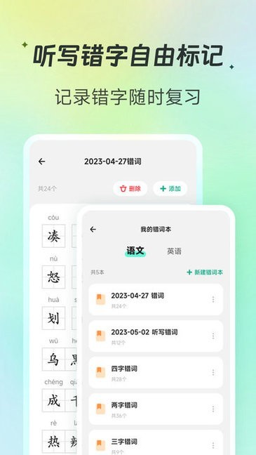4、支持各学期各教材版本的语文/英语/自定义内容的听写。支持分段听写,支持听写结果上传。